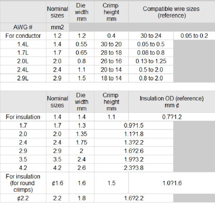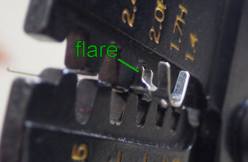 CRIMPING BASICS – insert terminal in crimper, insert stripped wire, squeeze crimper handles – see pics on this page for terminal insertion positioning. Strip wire wider than the wire crimp tabs, test, adjust until 1-3 mm of wire sticks out the far side of the crimp. With all the crimpers I sell, crimping is easy once you select the right dies for your wire and terminal sizes. If your crimp squeezes the material too much use larger dies. If the wire pulls out use smaller dies. A good crimp will not allow the wires to pull out, it will not deform the terminal, a good dent will appear on the backside of the crimp area. This dent will help you to judge consistency but will vary with material and sizes.
