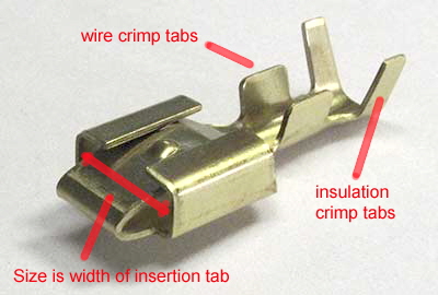 Terminal sizing is based on the width of the male terminal’s insertion tab. The female opening as shown above will be slightly larger. Size is usually shown in thousandths of an inch. The above terminal is a .250” size.