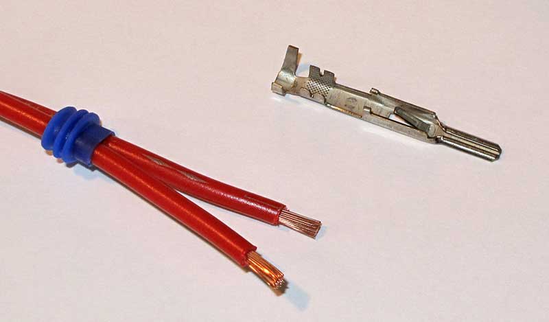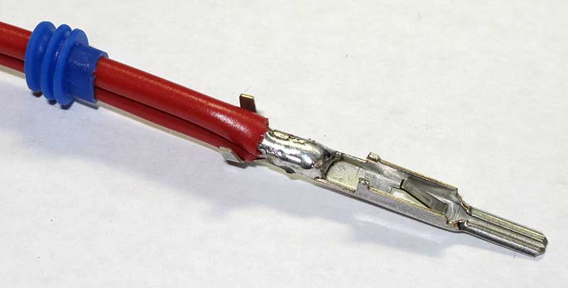 If you just have one wire per terminal, you can also see the tutorial for MetriPack 630 terminals further down this page. If you have a pair like shown here, marvel at the workmanship 🙂 You can do it too!