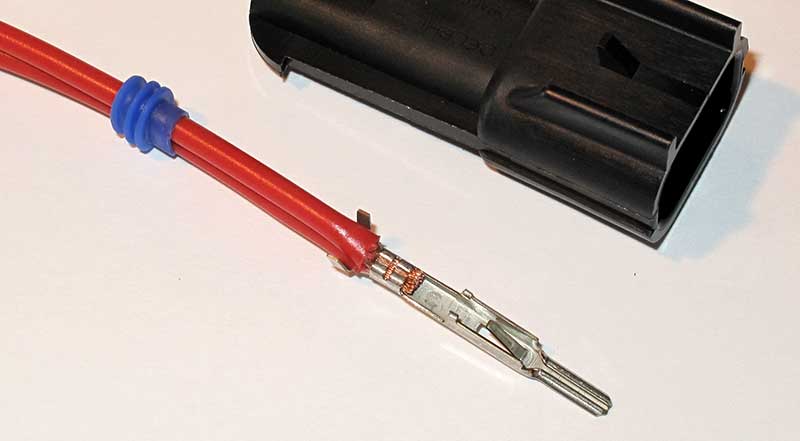 Pic 1 – the seal is in place and then the wires are stripped.  You’ll need the larger blue seal for two 14 gauge wires. To get the wires into the seal, place the seal on the end of a set of long nose