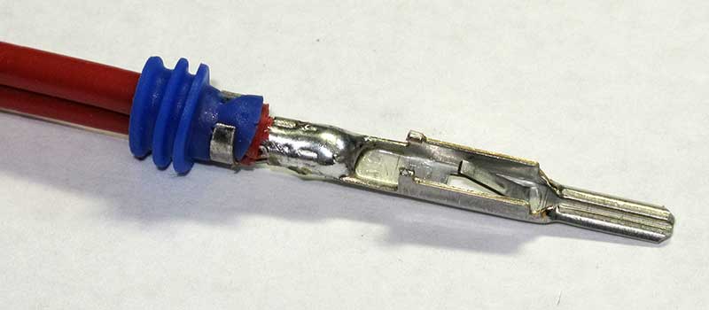 This page will show you how to DIY a terminal into a MetriPack (or other type) of sealed connector. Most people don’t have the right crimper but you can do it if you can solder and work carefully. You’ll also need a wire stripper and needle nose pliers, tools that most people have around the shop. Practice first on some scrap wire and extra terminal! The following photos show how to get two 14 gauge wires into one 12 gauge terminal. Some R/R unit have 4 output wires instead of just one ground and one positive output, they have a pair of each, of smaller gauge. Users with one pair of 12 gauge outputs are lucky, but they still have to properly strip and solder their wires onto the MP280 (or any other) terminals. This is very important so that you do not get resistance which causes heat and power loss.