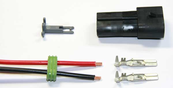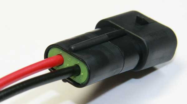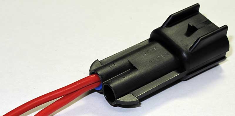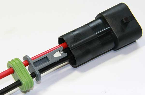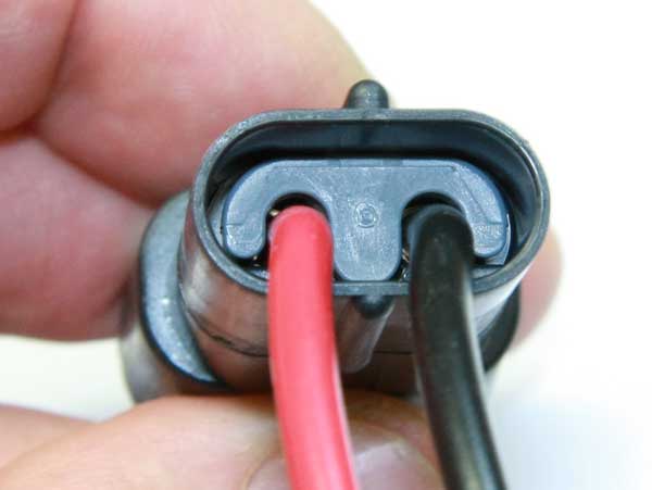 Push both terminals into the housing until they click. Make sure you  have the red and black lined up with the female half’s red and black  wires! The retainer will push into place as shown. NOTE: Housing looks  similar on both sides, but only one side has the locking tab. The  retainer will be orientated correctly with the housing as shown below.