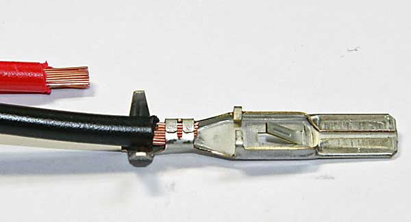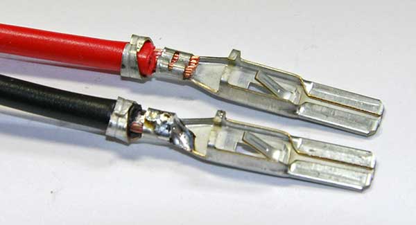 Pic 2 – the wire tabs are bent to hold the wire strands (shown here they are crimped). The main thing is to capture all the wire strands. On this terminal there’s lots of space for a bulky pinch/solder as the connector opening is large. Use a pair of needle nosed pliers and holding the wire strands in place, bend the tabs to capture them enough so they won’t move. There’s no need of pinching them hard, you’ll likely distort the terminal. As you can see below, although these wires are fairly well crimped, the tabs were not large enough to really crimp them properly. Therefore they must be soldered.
