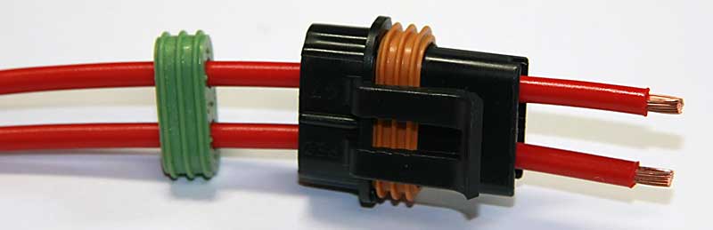 Single Wire per Terminal – MP 2P630 Male Shown (female at bottom of page) Note, that the female 2P MP630 is different in that the wires go through the housing then are crimped and pulled back into the housing. Start by putting the seal over both wires and stripping the wires 3/16” (5mm).