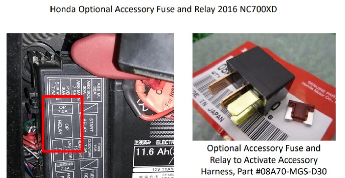 This harness duplicates (betters) Honda’s at a lower price. We make them ourselves. The relay and fuse fit into the open slots in the bike’s relay/fuse panel. You can plug in Honda’s Heated Grips, Power Socket, and Fog Lights.