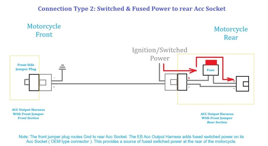 Alternatively, by placing a jumper connector on the front connector ( routing ground to the rear connector ), and using a rear harness with fuse holder, you can have switched and fused power at the rear of the motorcycle.