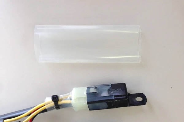 Clear shrink tube ( heat shrink ), 24mm or 28mm ID before heating. Great for covering connections, relays, and more. No glue inside so easy to peel off and replace if necessary. You can see if there’s a broken wire or burnt connection. 2:1 shrink ratio. Made in Japan by Sumitomo.