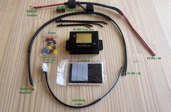 Compact yet powerful accessory fuse box. Provides 6 switched and 2 battery direct connections. On board relay and rated at 40A total. Max switched current of 30A and max battery direct of 15A ( total must be 40A or under ).